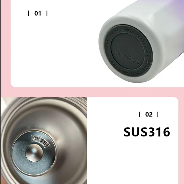 यह स्ट्रॉ के साथ वैक्यूम अछूता स्टेनलेस स्टील की बोतल है, सामग्री 316 स्टेनलेस स्टील (आंतरिक भाग) और 201 स्टेनलेस स्टील (बाहरी दीवार) से बनी है, क्षमता 500 मिलीलीटर है।